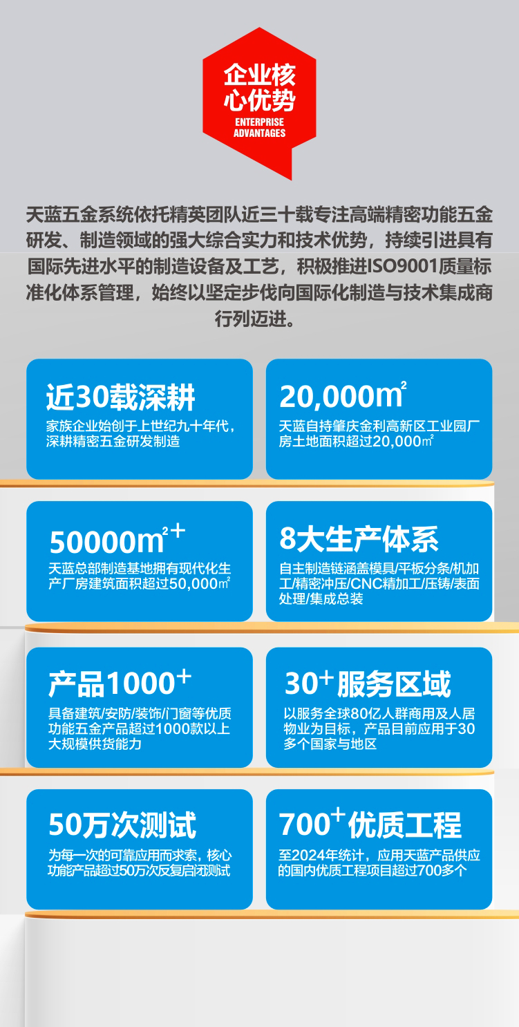 天蓝以精工品质及领先的功能五金应用技术服务于广大客户,致力于为建设工程项目创造可观的附加价值。天蓝旗下系列产品按照国际先进技术研发制造,