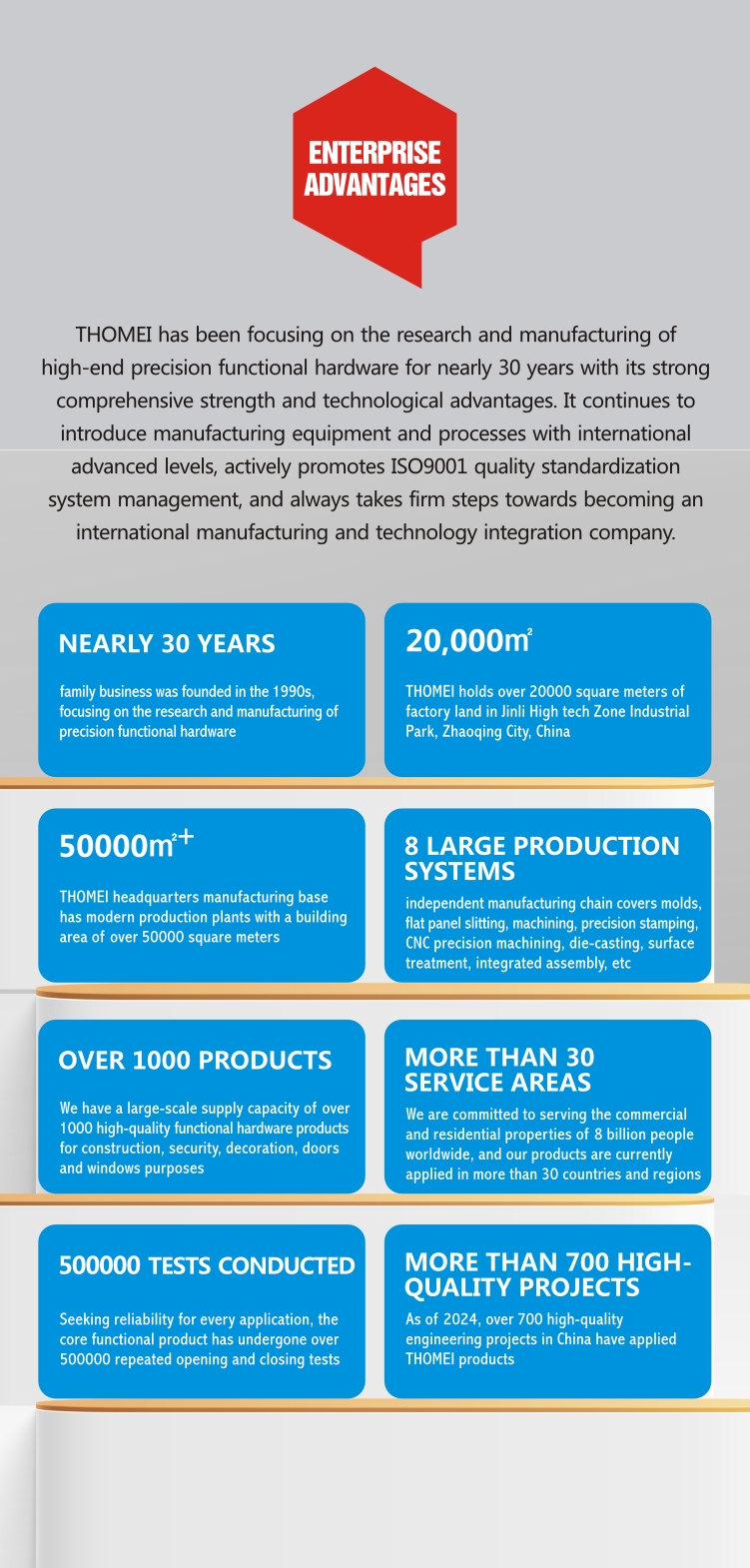 Guangdong THOMEI Building Hardware Co., Ltd. is located in the headquarters manufacturing base of Jinli High tech Industrial Development Zone in Zhaoqing City, China. It covers an area of over 68000 square meters and has a production plant with a building area of over 50000 square meters.It has modern standard production plants that meet national environmental protection and safety manufacturing requirements. THOMEI has an advanced automated production equipment system that covers the manufacturing chain process of its product line,Enable the company to have a production scale that ranks among the top in the industry in terms of annual output. As a highly competitive professional manufacturer in the industry, Tianlan Hardware can meet the needs of numerous customers for efficient and high standard large-scale production orders. Relying on strong capabilities and first-class supporting production capacity…